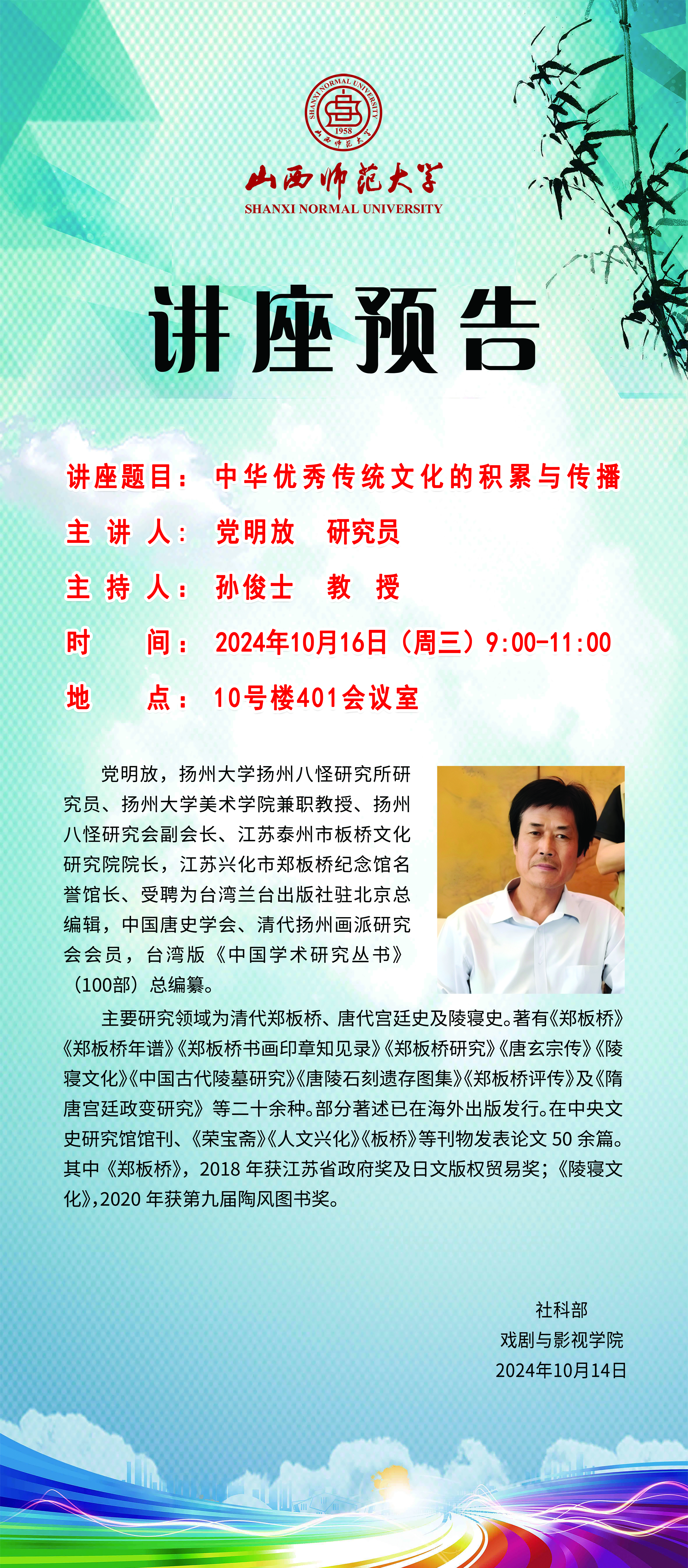 公司拟于10月16日(周三)9:00-11:00在南区10号楼401会议室举办《中华优秀传统文化的积累与传播》讲座,主讲人为党明放研究员,本次讲座由副经理孙俊士教授主持。