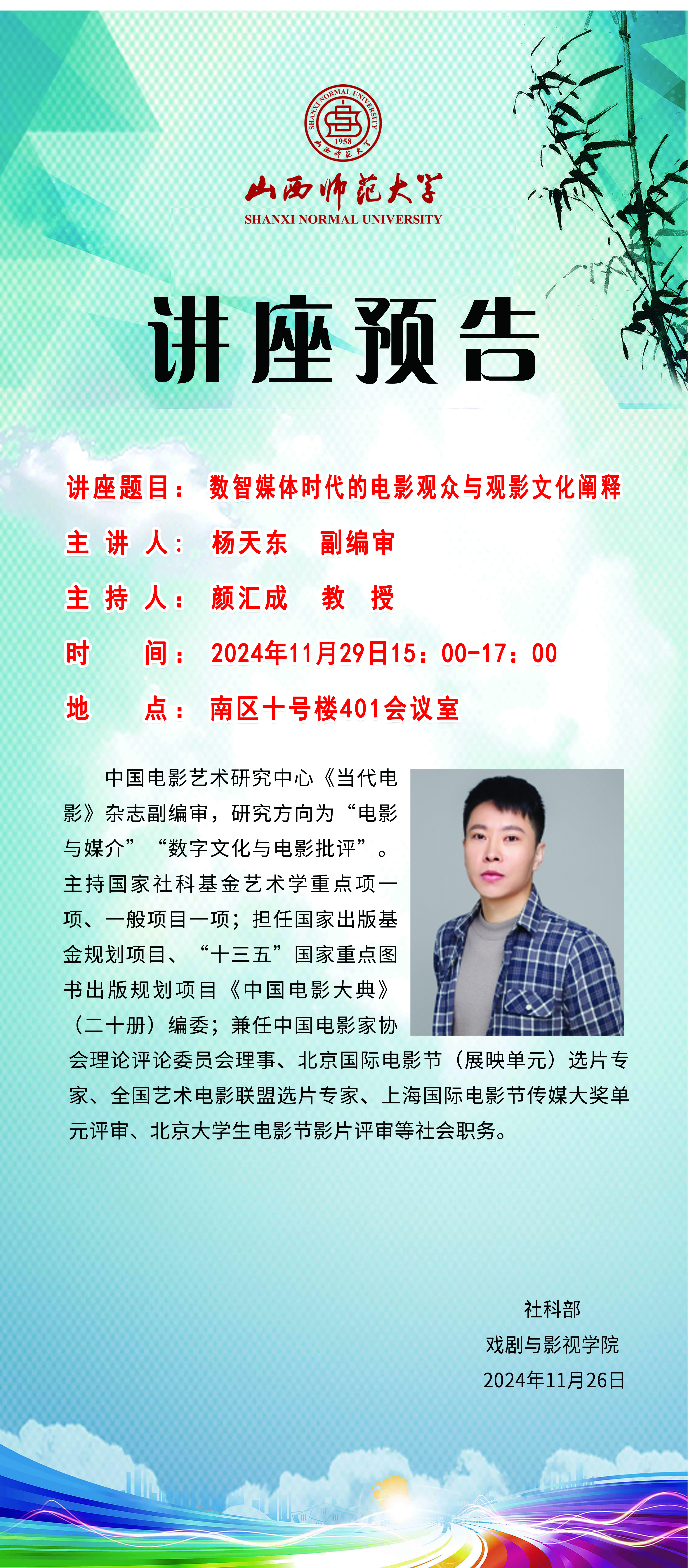 公司拟于11月29日(周五)15:00-17:00在南区10号楼401会议室举办《数智媒体时代的电影观众与观影文化阐释》讲座,主讲人为杨天东副编审,本次讲座由副经理颜汇成教授主持。