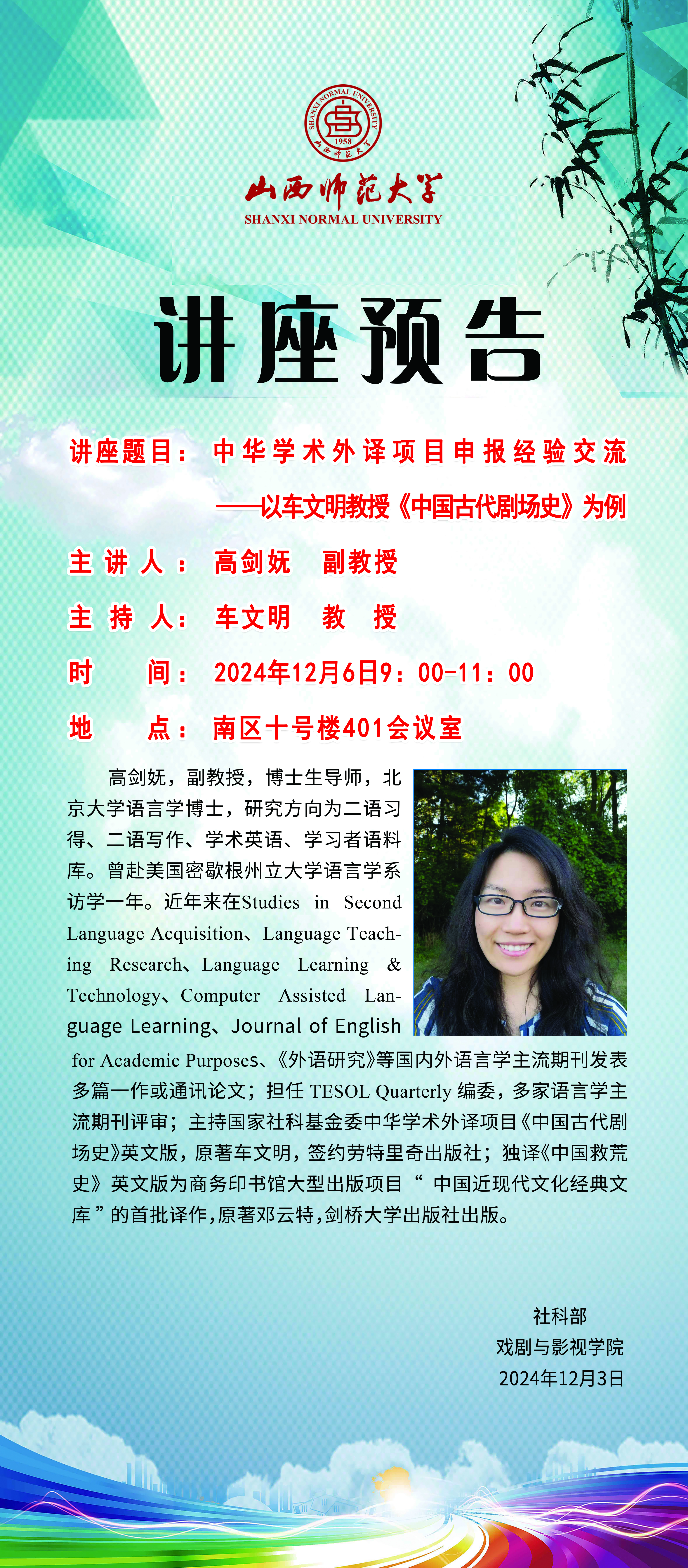 公司拟于12月6日(周五)09:00-11:00在南区10号楼401会议室举办《中华学术外译项目申报经验交流——以车文明教授<中国古代剧场史>为例》讲座,主讲人为高剑妩副教授,本次讲座由车文明教授主持。