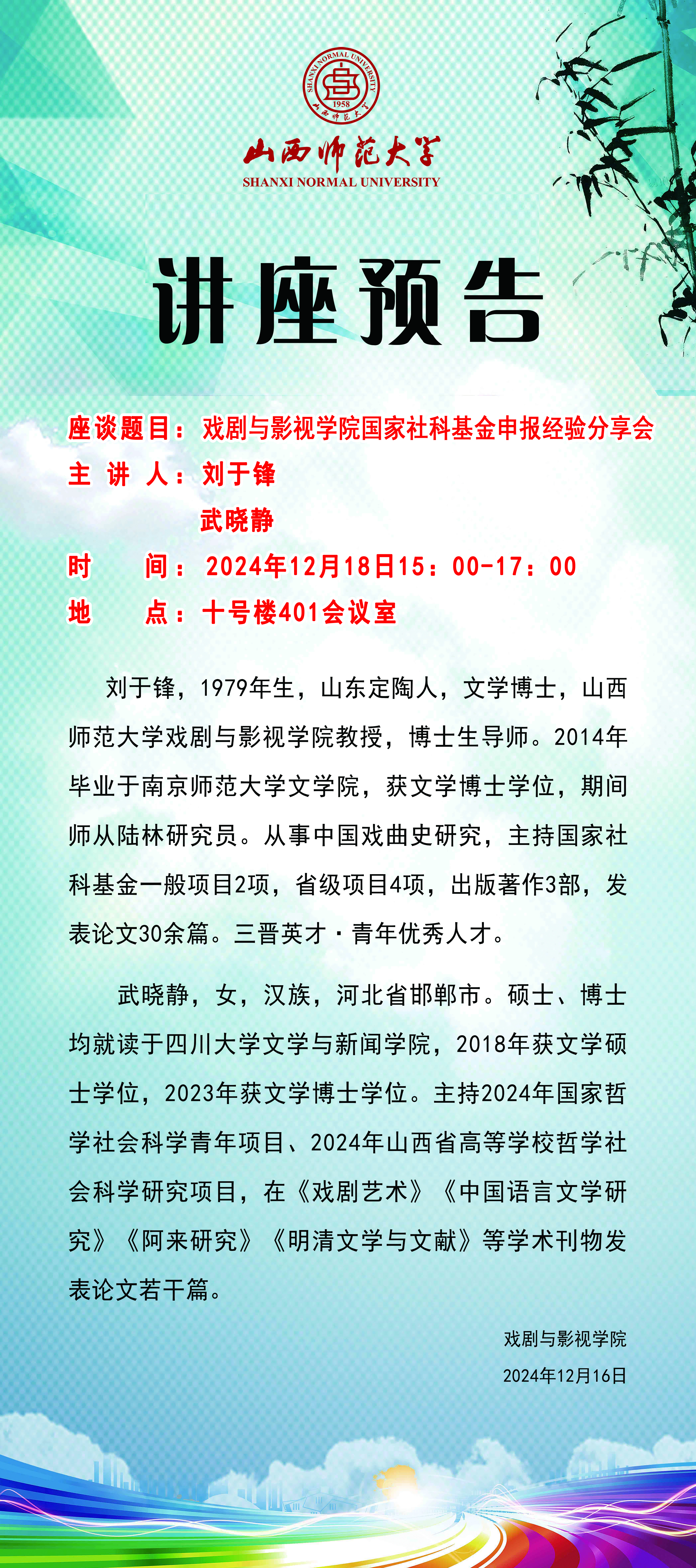 公司拟于12月18日(周三)15:00-17:00在南区10号楼401会议室举办《明胜m88官网国家社科基金申报经验分享会》,主讲人为刘于锋教授、武晓静老师。