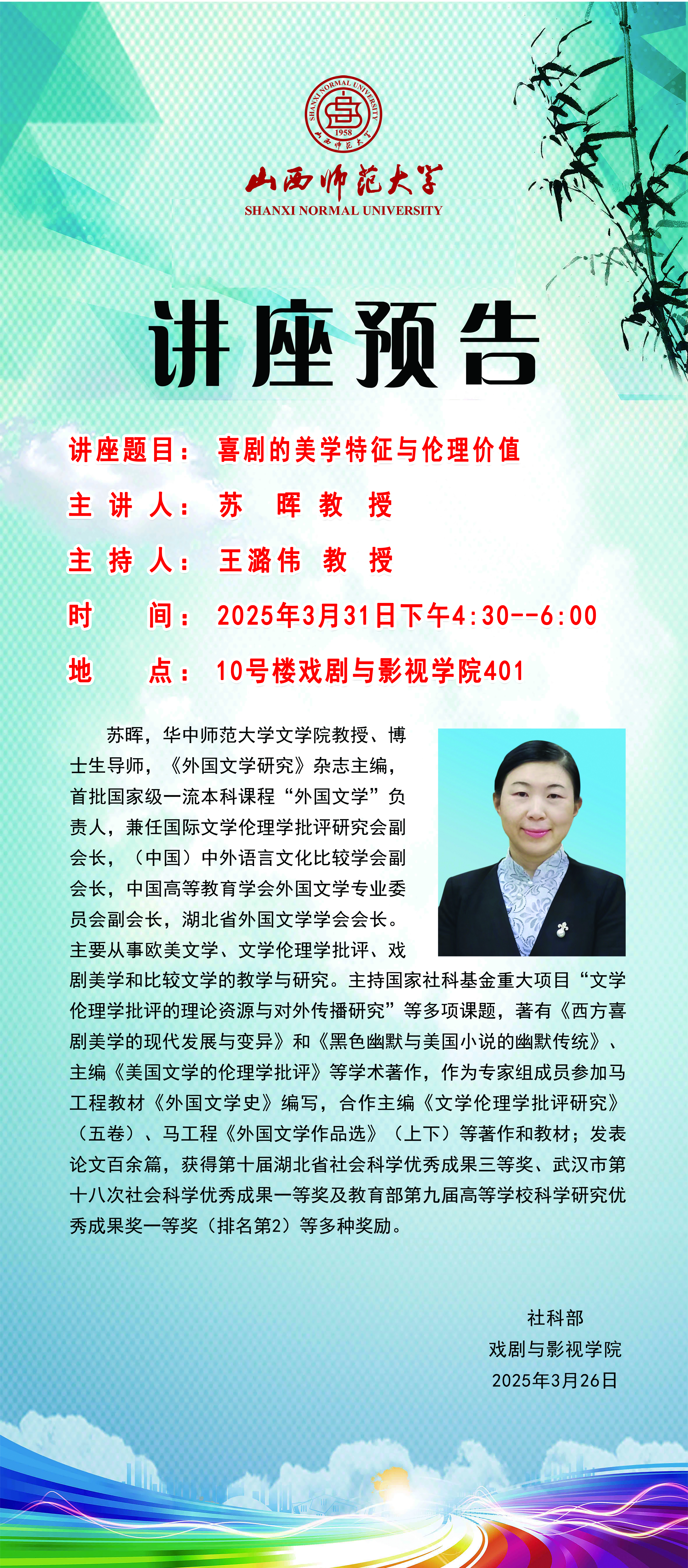 公司拟于3月31日(周一)16:30-18:00在南区10号楼401会议室举办《喜剧的美学特征与伦理价值》讲座,主讲人为苏晖教授,本次讲座由王潞伟教授主持。