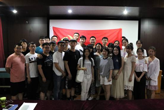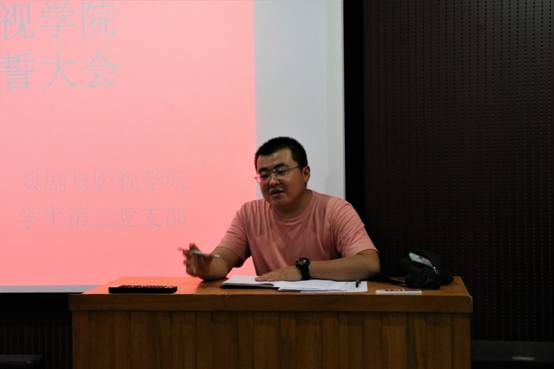 会议第三项,全体党员合唱《国际歌》,之后刘旭东书记带领吕悦桢、刘微微、侯超宇、张丹妮四位同志进行入党宣誓。
