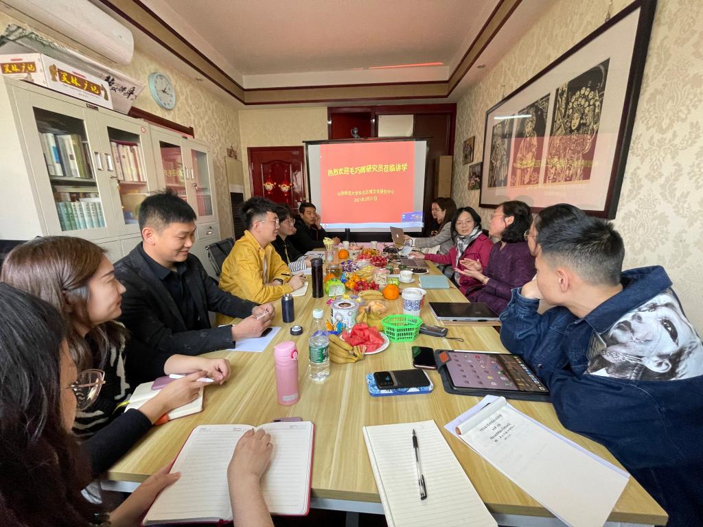 姚春敏教授首先对毛巧晖研究员莅临中心交流座谈表示热烈欢迎。本次座谈的题目是《中国民间文学的研究现状与发展趋势》。毛老师从研究文类、研究对象和学术史三方面阐述了中国民间文学的研究现状。她认为在新文科背景下,应该以多维度、多视角的方法进行研究,打破学科壁垒,不同学科之间形成对话。然后,毛老师从非物质文化遗产、民间文学研究的多路径以及多媒体传播等方面为大家解读民间文学研究的新趋势。她强调民间文学的研究对象很关键,学科不是界限,一定要注意研究对象和当下的联系。最后,毛老师根据自己多年的研究心得,结合大家的不同方向,对师生们提出的问题进行了详细解答。通过此次座谈,同学们在学术视野和研究方法等方面受益匪浅。