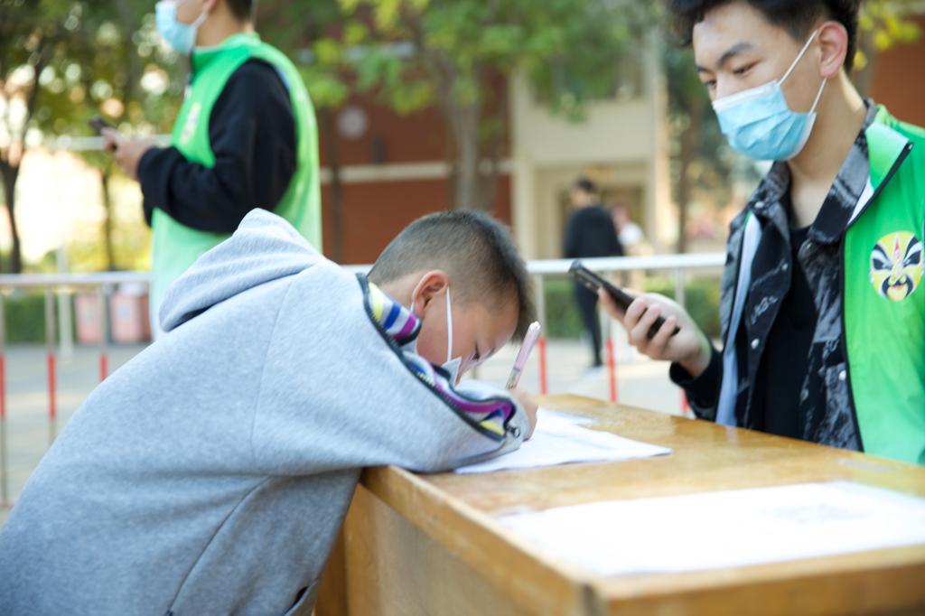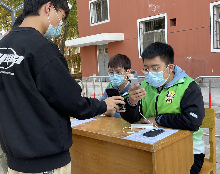 在检测点,志愿者们在现场负责队伍引导、查健康码、扫码登记、分流待检人员等工作,通过设立人工登记处、二维码扫描处两种不同的登记方式,确保每位同学顺利进行核酸。吵杂的采样点,在“绿马甲”的点缀下,也变得有序了起来。志愿者们认真地把好每一道关,确保核酸检测工作顺利高效进行。