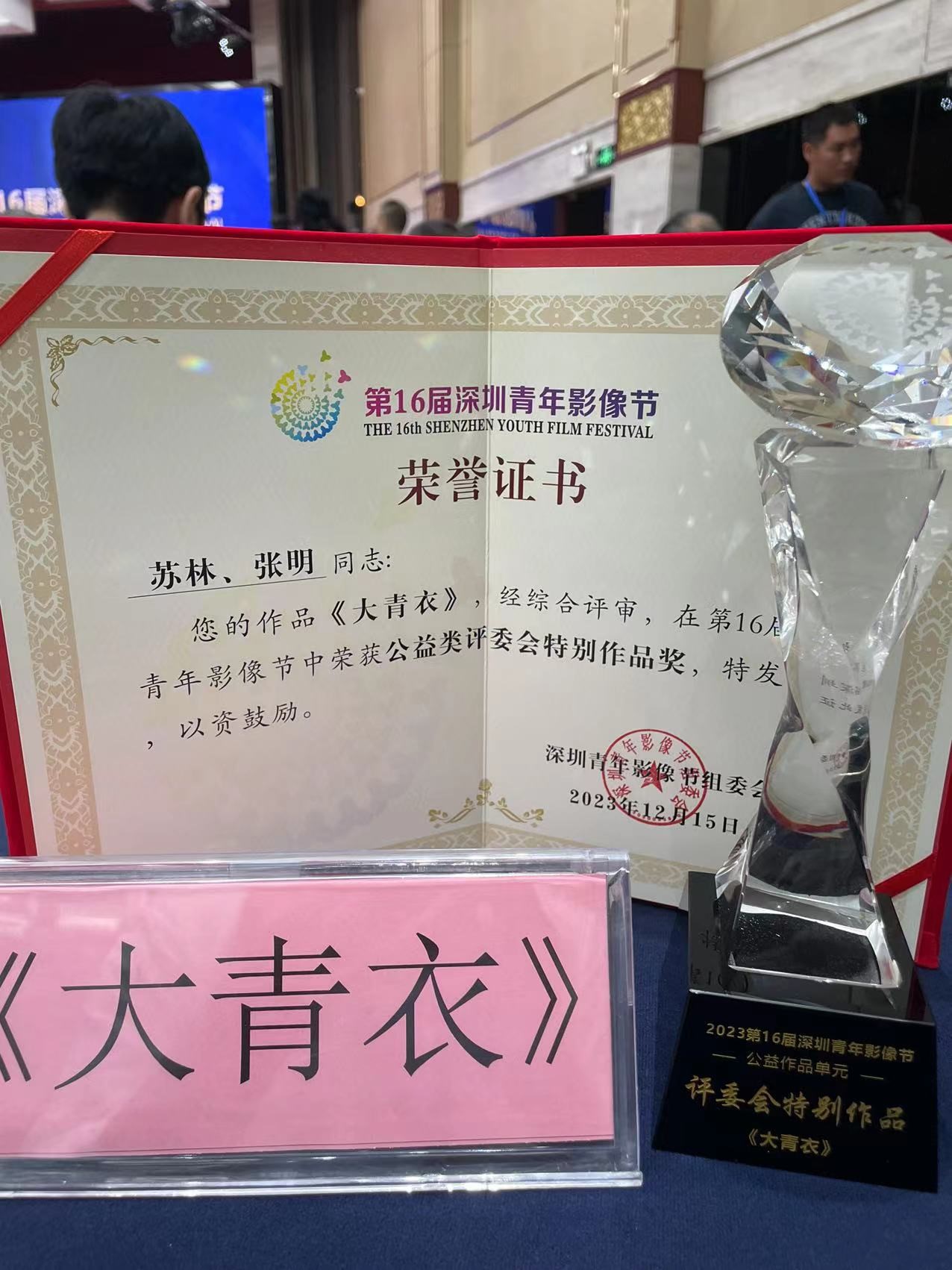 12月15日—17日,第29届中国纪录片学术盛典暨第16届深圳青年影像节在深圳举行,本届影像节以“世界和平·保护地球”为主题,分纪录片、动画片、环保类、国际、剧情片、公益环保等单元,评委会从867部参赛作品中精心甄别挑选,评选颁发数十个奖项。公司2023级博士研究生苏林作品《大青衣》获得公益类评委会特别作品奖。