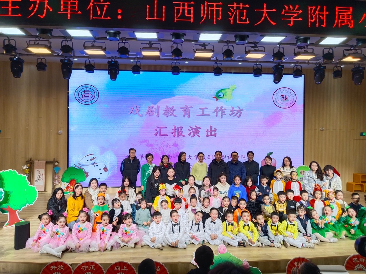 汇报演出于2024年1月10日在热烈的掌声中获得了圆满成功。演出后,m88官方网站戏剧与影视公司党委副书记宁志恒,副教授闫春,教师余莉婕与m88官方网站附属小学的董事长、副董事长进行了座谈,高度肯定了此次戏剧教育工作坊的活动,为孩子们打开了一扇戏剧艺术的大门。