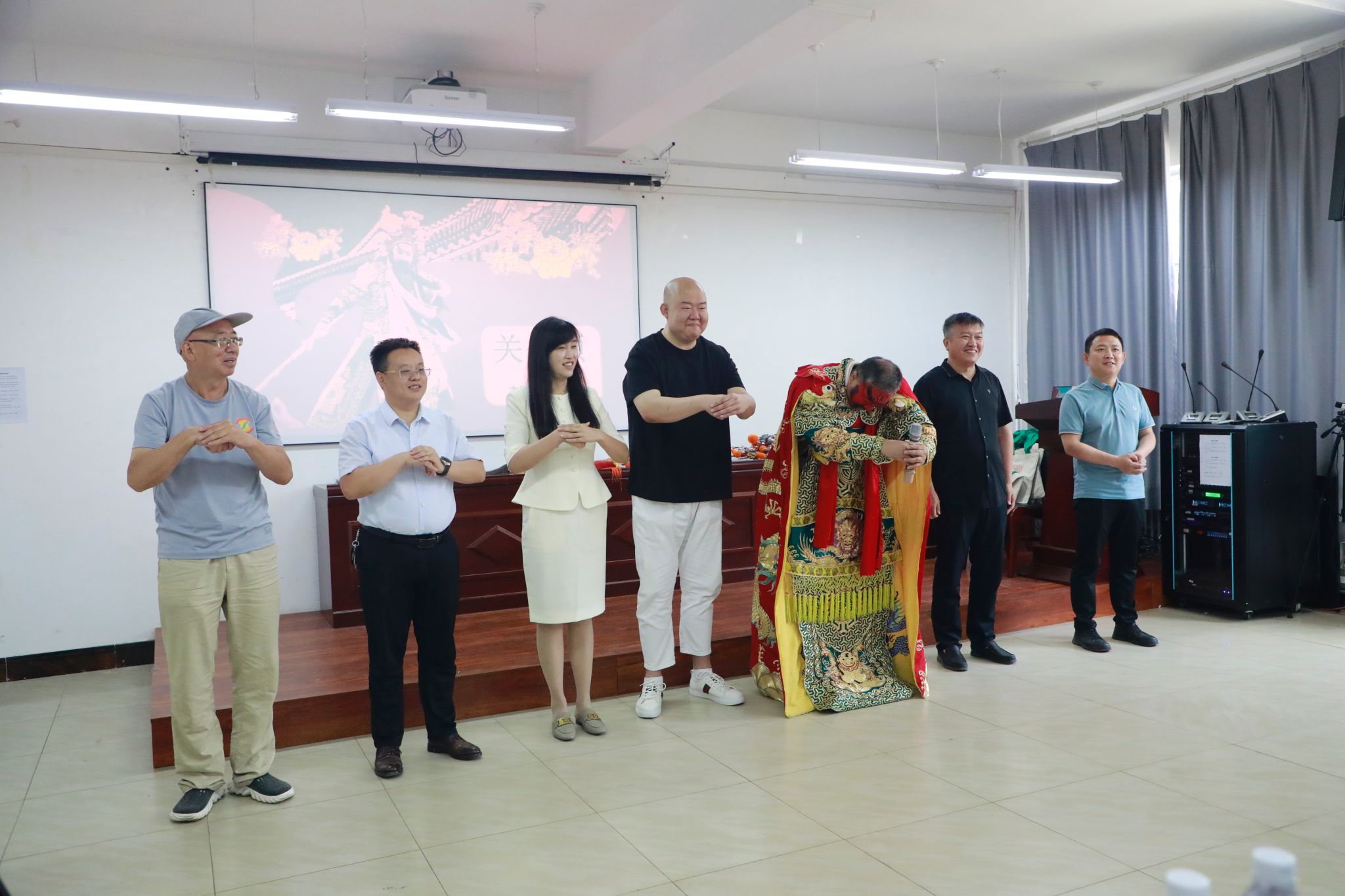 2024年6月22日上午,著名晋剧表演艺术家、国家一级演员武凌云应邀来公司作《关公颂》专题讲座。中国文化报驻山西记者站站长郭志清、校新时代宣传思想文化研究院副经理姜彭译、马克思主义公司党委书记乔瑞、公司经理王潞伟、党委副书记宁志恒、副经理孙俊士以及相关公司部分师生参与了此次讲座。讲座由经理王潞伟主持。