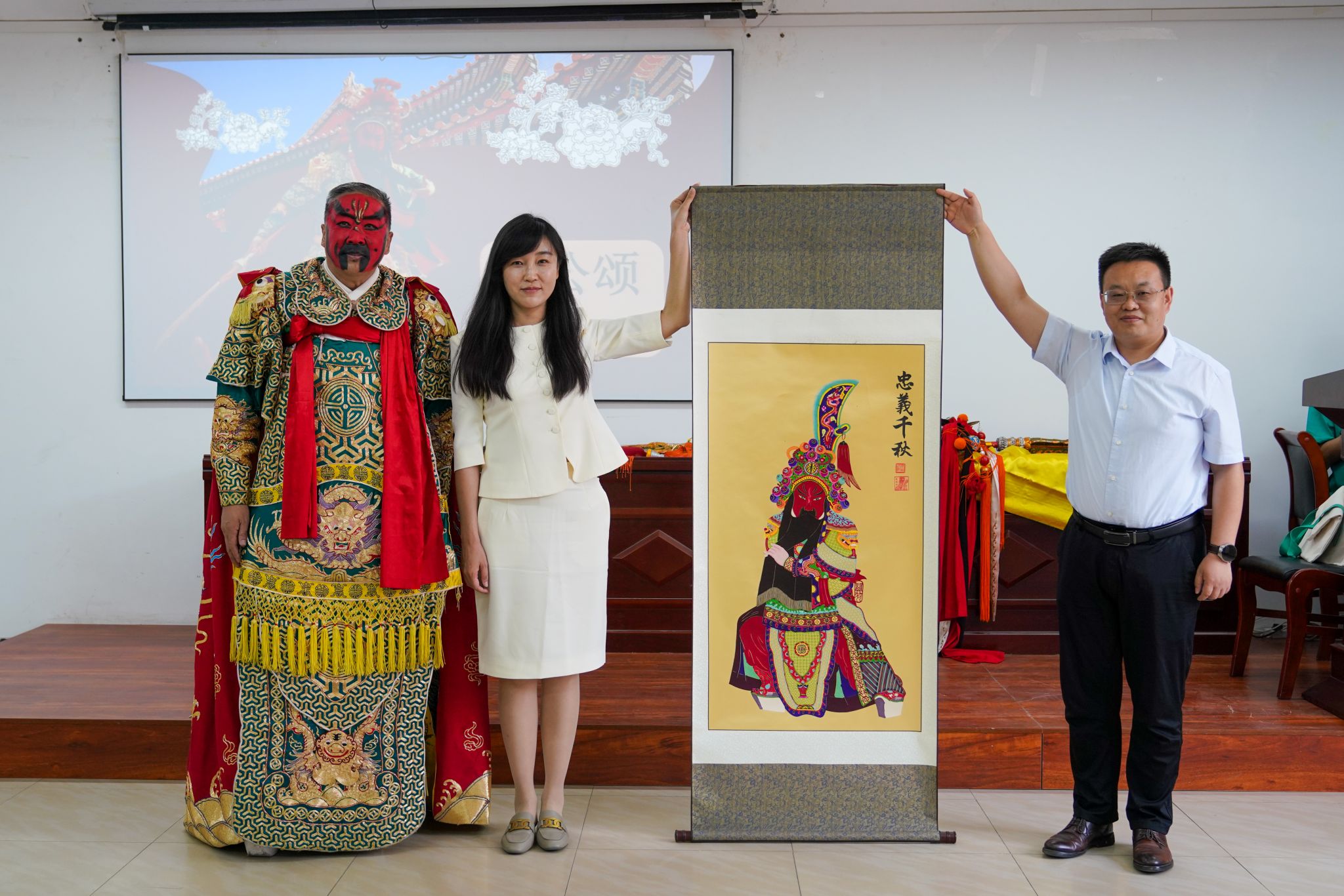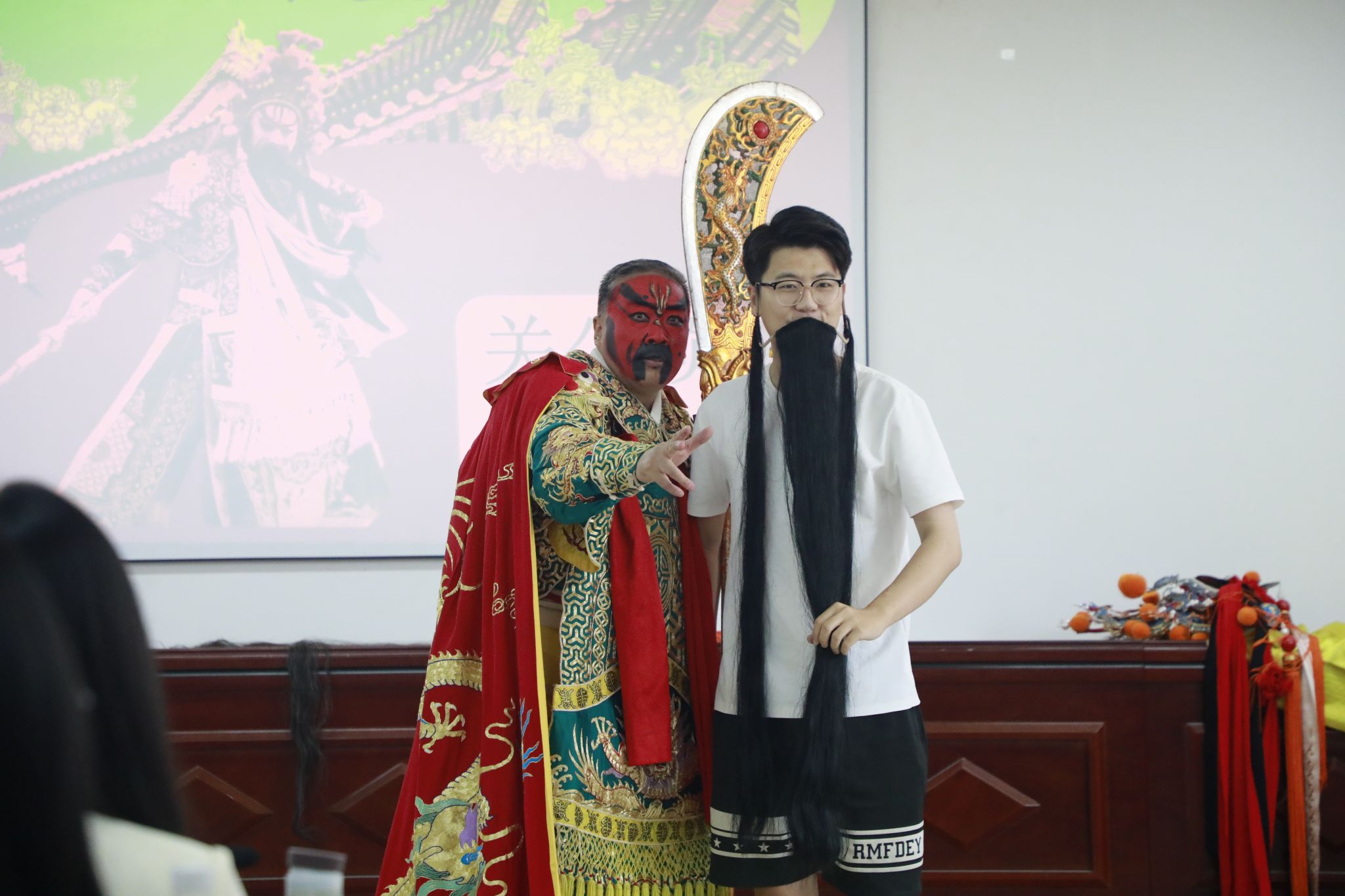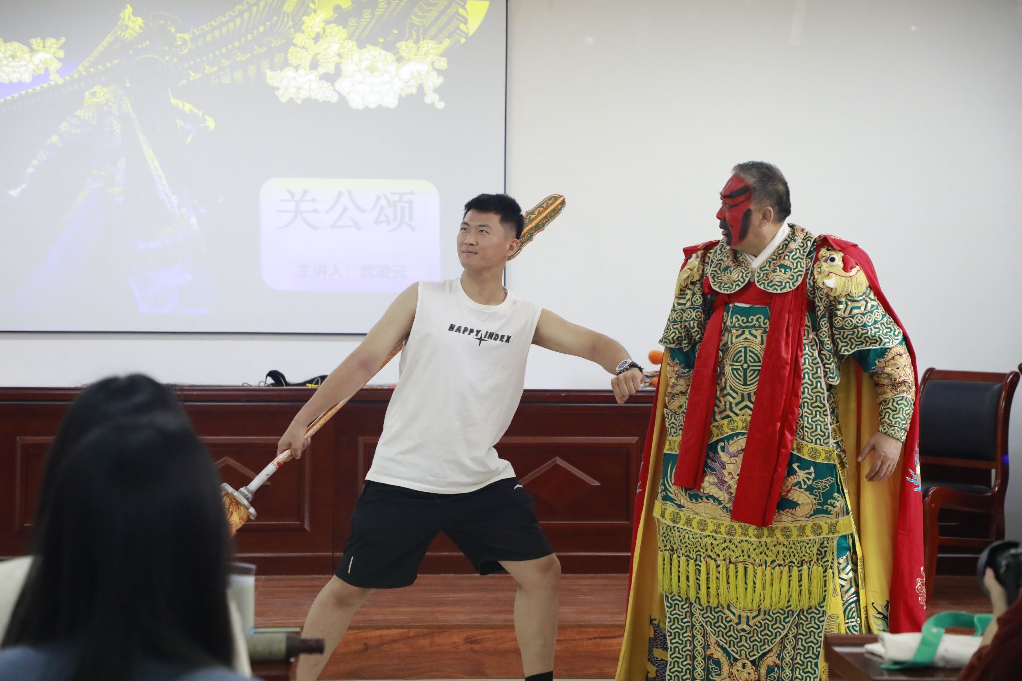 讲座结束后,武凌云还与在场的同学们展开了互动,邀请同学们现场体验饰演关羽,并亲自指导他们如何使用表演中的刀和剑。同学们对此反应热烈,积极参与。此外,武凌云还向明胜m88官网赠送了一幅关羽剪纸作品。最后,王潞伟经理作了总结发言,讲座在圆满的氛围中落下帷幕。