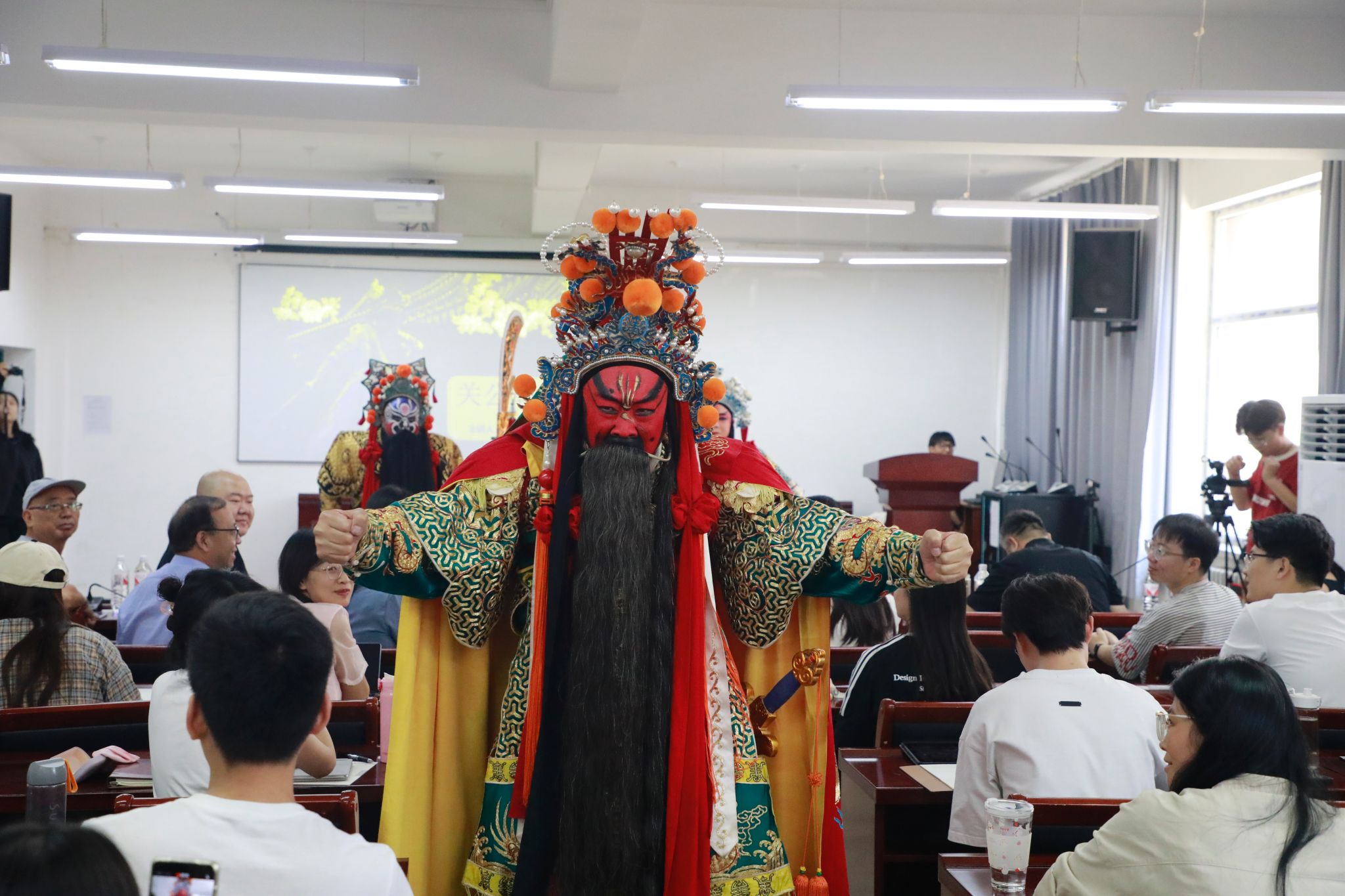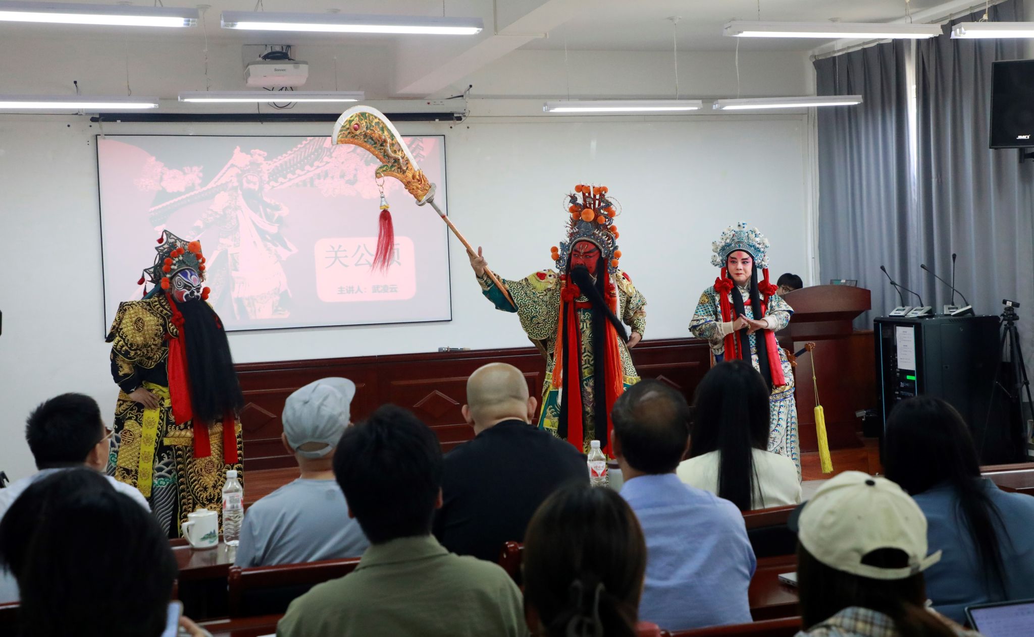 讲座上,师生们首先欣赏了武凌云的表演短片。紧接着武凌云表演了一段《走麦城》中的一段,生动地展现了关羽的英雄形象和忠义精神,给现场师生留下了深刻的印象,受到了现场老师和同学们热烈响应。紧接着,武凌云详细介绍了关羽在戏曲中的服饰、花脸以及专属道具。此外,他还深入阐述了关羽的忠孝仁义,强调关公精神就是忠于国家、忠于民族。同时,他分享了自己赴国外演出的经历,并表示戏曲演员走出国门代表的是中华民族,传播的是中国优秀的传统文化,作为一名扮演关公的戏曲演员,精气神至关重要,而更为关键的是要忠于祖国、热爱祖国。
