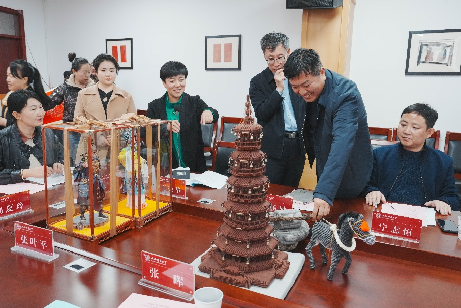 会谈期间,朔城区非遗传承人展示了沙画、剪纸、面塑、珐琅彩工艺等作品。双方就朔城区当地非物质文化遗产的保护、研究及当前传承、宣传等问题展开交流。