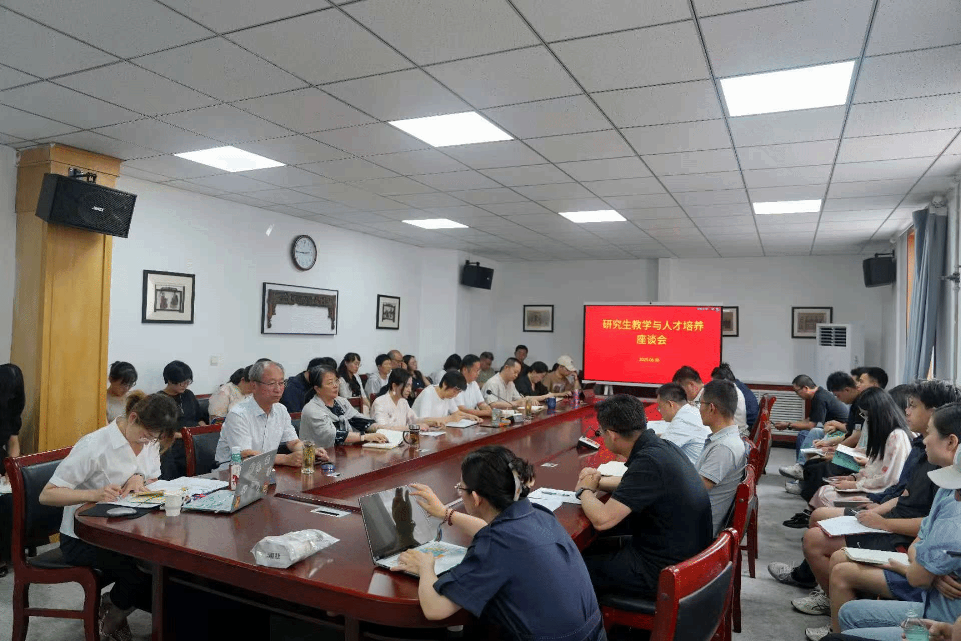 汇报环节主要聚焦教学实践,2024级研究生授课教师代表介绍了各自课堂教学组织与员工能力培养情况,2024-2025年引进博士教师代表则结合原就读高校经验,分享了国内外戏剧影视学科在课程建设、教学理念及质量保障方面的做法。在研讨环节,与会教师们深入讨论了培养方案课程体系优化、专业公共课教学内容设计、研究生教学方法改进,以及教学对人才培养质量提升作用等关键问题。大家经过讨论,一致认为需加快前沿性与实践导向的课程体系更新;构建教学协同机制;加强师生互动,着重培养员工批判性思维和解决复杂问题的能力。