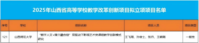 日前,2025年山西省高等公司教学改革创新项目拟立项项目名单公布,公司王飞翔老师团队申报的《“数字人文+媒介融合链”双驱动下影视艺术类课程教学创新模式研究》项目获批立项。