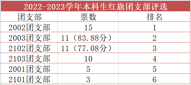 汇报过后,李蓓蓓老师对各团支部汇报成果表示肯定,强调各团支部间要积极配合,扎实推进基层组织建设,坚持以青年为主,服务青年,真正把团支部建设成为青年们信任的组织。各团支书也表示在今后的学习、工作中要及时总结反思,勇于创新,注重实效,继续在行动中坚守知行合一,在反思中不断奋进超越。最后,由参会人员投票选出的红旗团支部为:2002团支部、2003团支部。