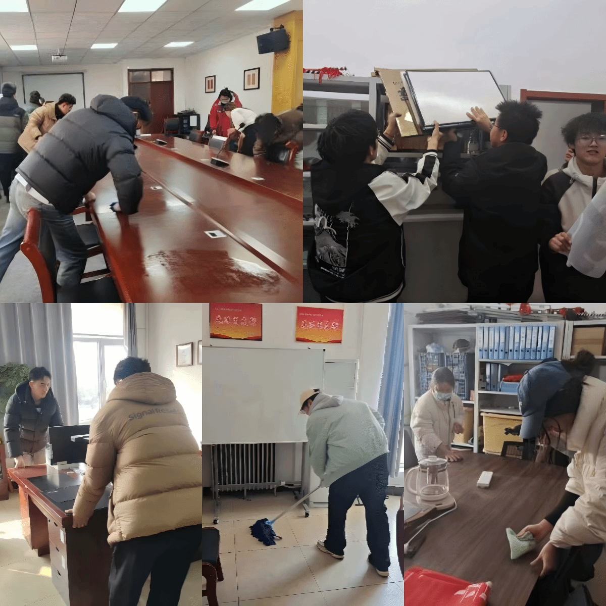 活动现场,志愿者们手持扫帚、簸箕、拖把、抹布等工具,迅速投入工作。他们认真清扫地面,不放过任何一片纸屑;精心擦拭桌面,让办公用品焕然一新。大家分工明确,配合默契,干劲十足。忙碌的身影穿梭在各个角落,欢声笑语回荡在十号教学楼,为略显严肃的办公与会议空间注入了活力,形成一道独特的风景线。
