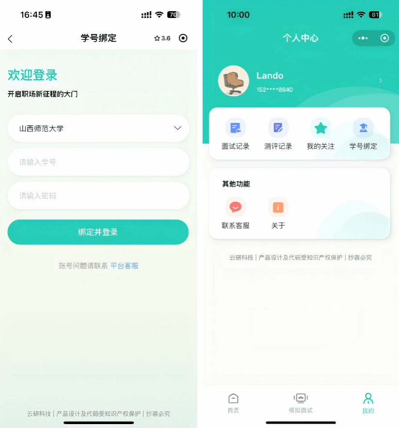 3. 进入后点击我的:学号绑定选择“m88官方网站”,输入学号、密码为身份号后六位,绑定并登录,你的个性化面试之旅即将开启!