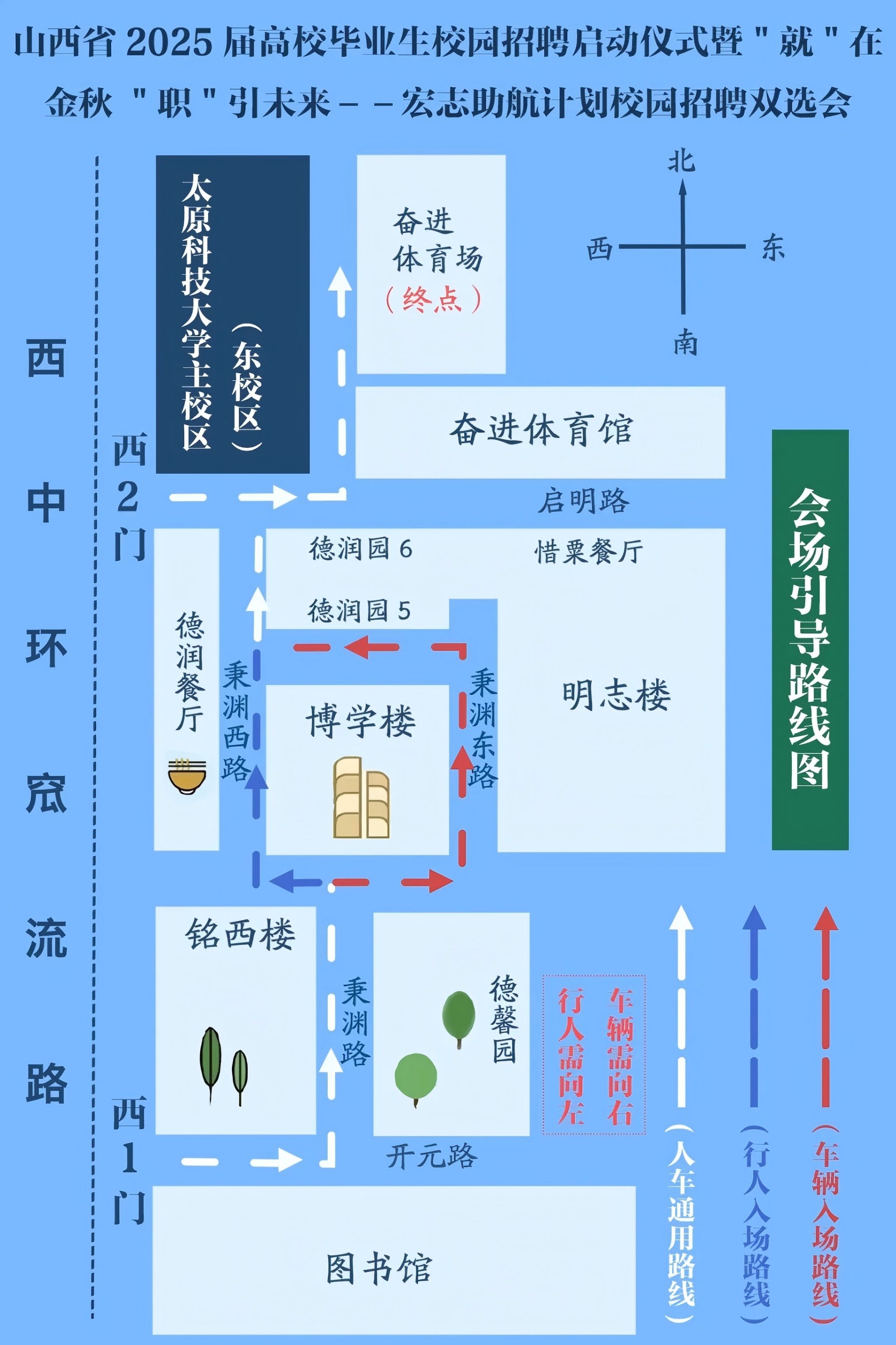 外校员工可持员工证、身份证或简历从太原科技大学主校区(东校区)西1门或西2门入校,沿路牌指示标进入会场;本校员工到场后需要打开企业微信扫码签到。